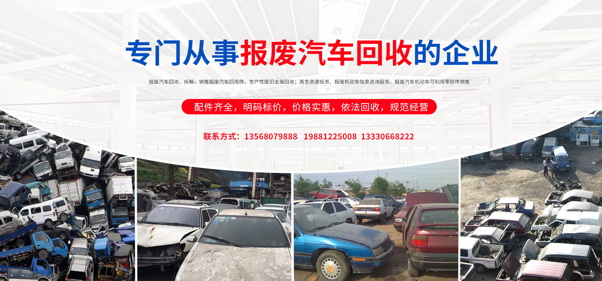 我公司在報廢汽車回收拆解中,認真貫徹執行國家法律法規,嚴格執行國務院令第307號,積極開展行業自律,依法回收,規范經營,從源頭上控制了報廢汽車整車、拼裝車、“五大總成”等上路和重新流入市場的現象,為緩解我市資源短缺,減輕環境污染,促進資源循環,維護人民群眾生命財產安全和道路交通安全起到了巨大的作用。